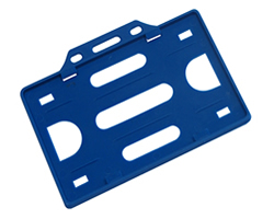 Porta-Credencial de Plástico Rígido, tamaño Tarjeta de Crédito. Visibilidad por un solo lado. No incluye lanyard. Presentación Horizontal, tamaño: 9.7 x 5.8 cm color azul y negro.